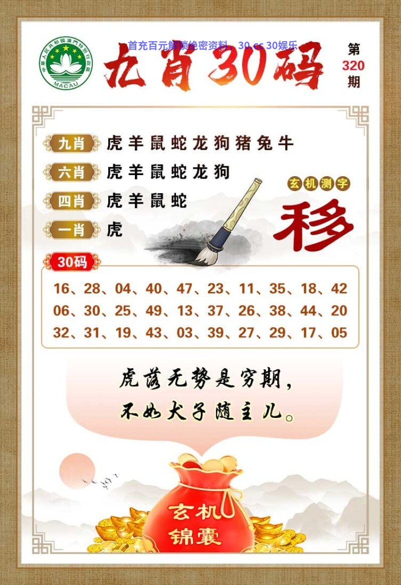 | 320期:九肖 | 狗龙蛇猴牛虎羊鸡兔 | 开:虎28 |